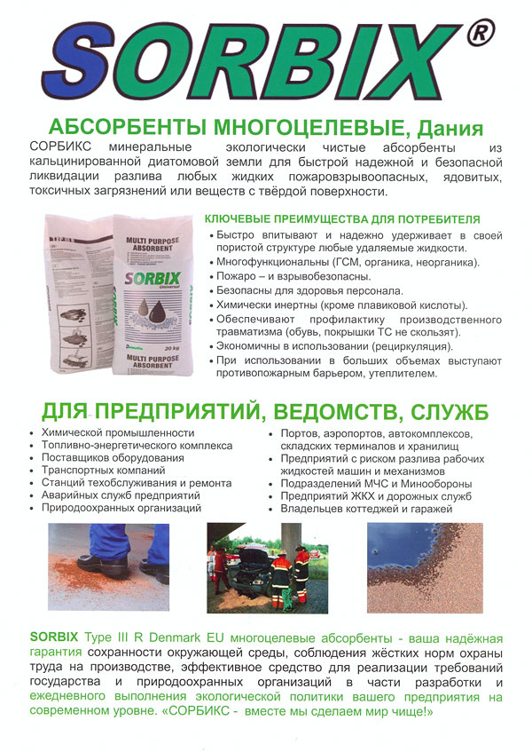 НовостиВ продажу поступил уникальный многоцелевой абсорбент, Дания01.02.2011 Сорбент SORBIX UNIVERSAL — минеральный сорбент (абсорбент) для ликвидации разлива любых жидких загрязнений или веществ с твердой поверхности (нефть и нефтепродукты, ГСМ, все кислоты кроме плавиковой, все щелочи, все растворители, растворы и другие химические вещества).